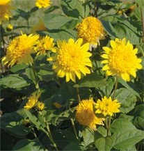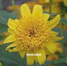 A terrific midsize perennial sunflower, ideal towards the middle of a sunny border but also short enough for containers or tubs. This forms an upright mound of pointy dark-green leaves. Strong stems appear by midsummer, holding bicolored daisies with yellow petals surrounding a wide anemone-style double golden centre or eye. Excellent for cutting. Plants prefer a sunny location but a rich and moisture-retentive soil. Easily divided in the spring. Cut the dead stems back to the ground in late fall, or leave for winter interest if desired.